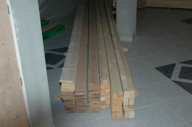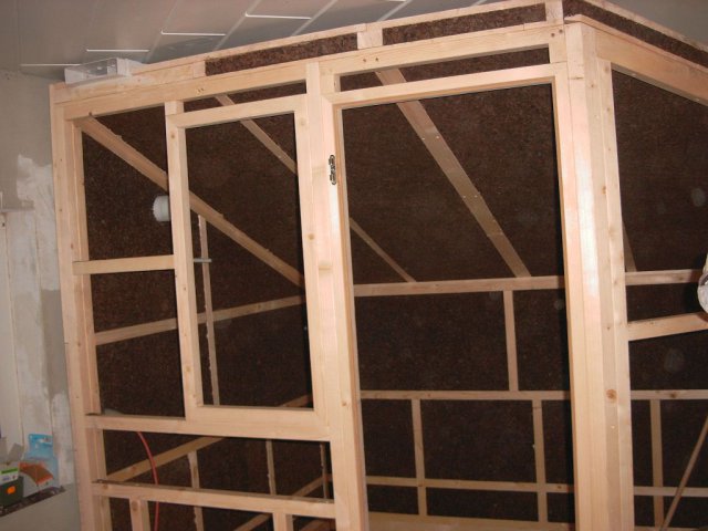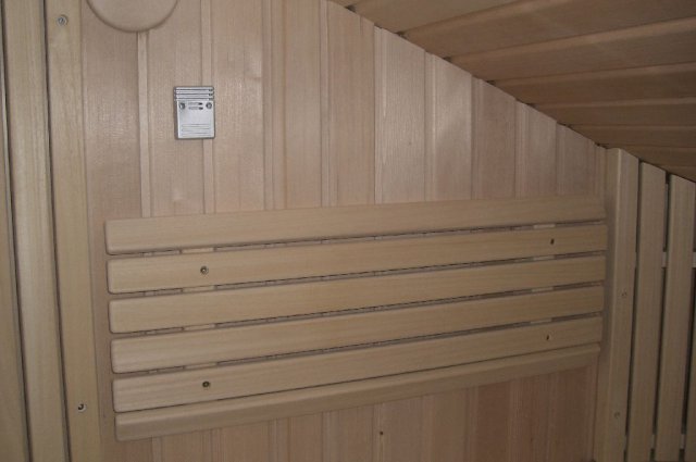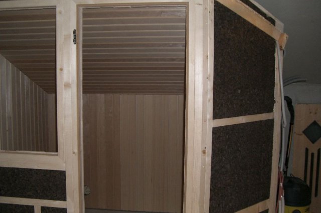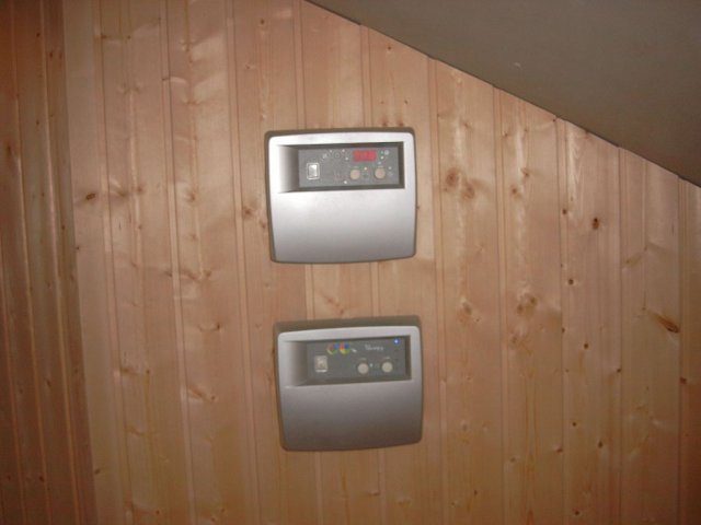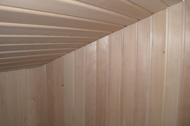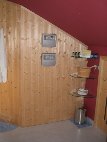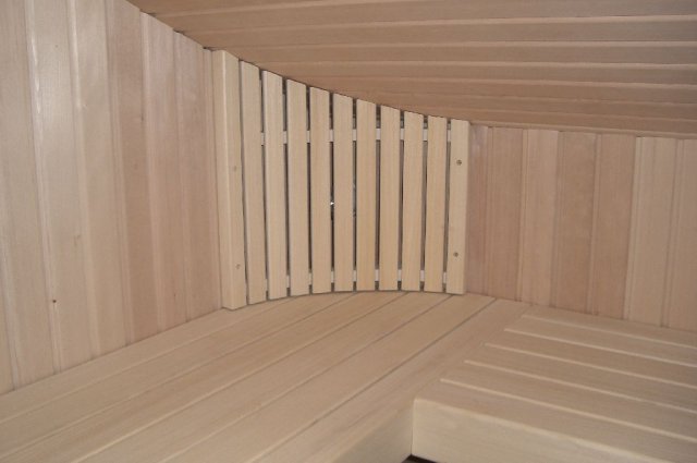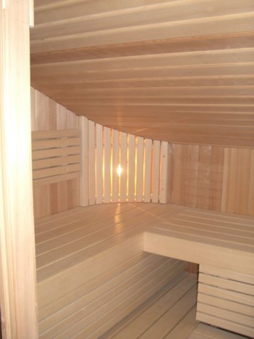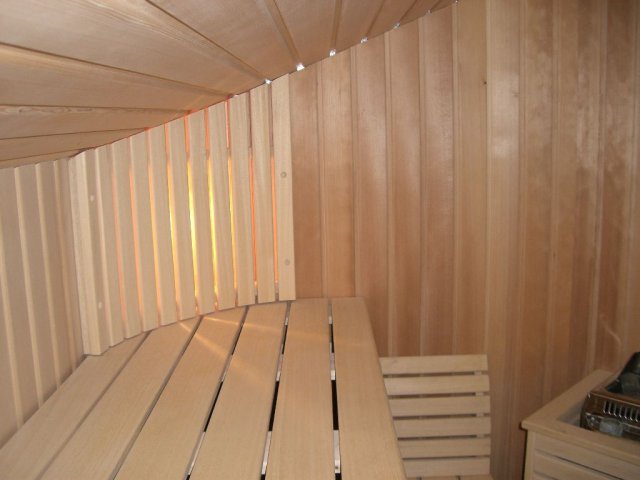 Aus Brettern aus kanadische Hemlock-Tanne und diversen Kanthölzern wurde eine Sauna in die Dachschräge gezimmert.