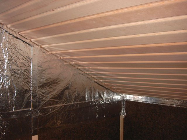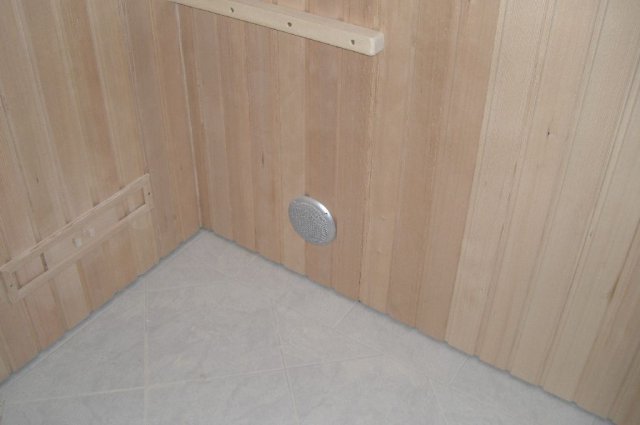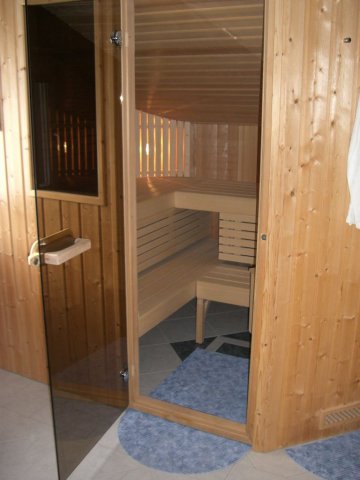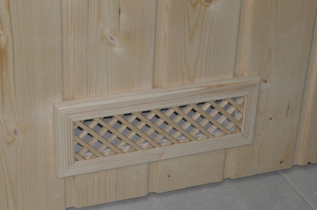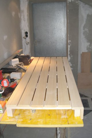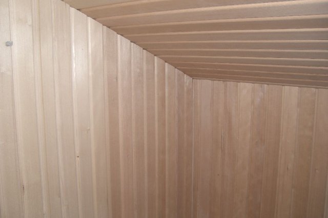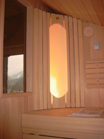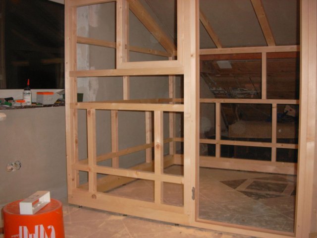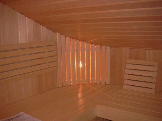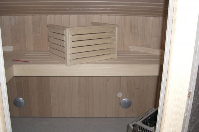 Aus Brettern aus kanadische Hemlock-Tanne und diversen Kanthölzern wurde eine Sauna in die Dachschräge gezimmert.
